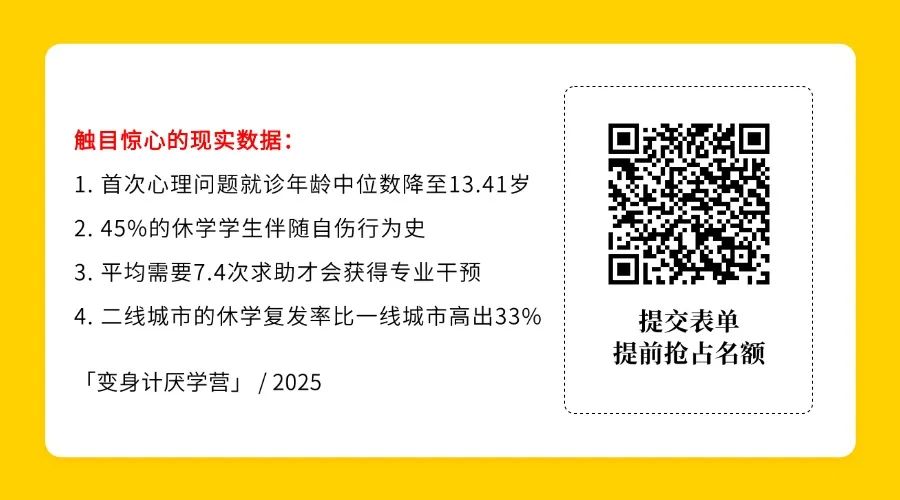 因此,我们特推出了 「变身计厌学营」由西点专业心理学团队研发,融合家庭治疗+积极心理学+行为干预,专攻"上学困难症",已帮助3000+家庭重启学习正循环!